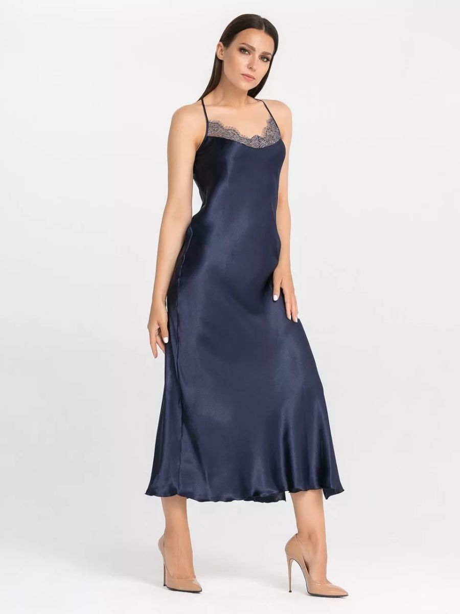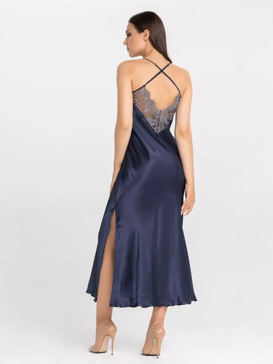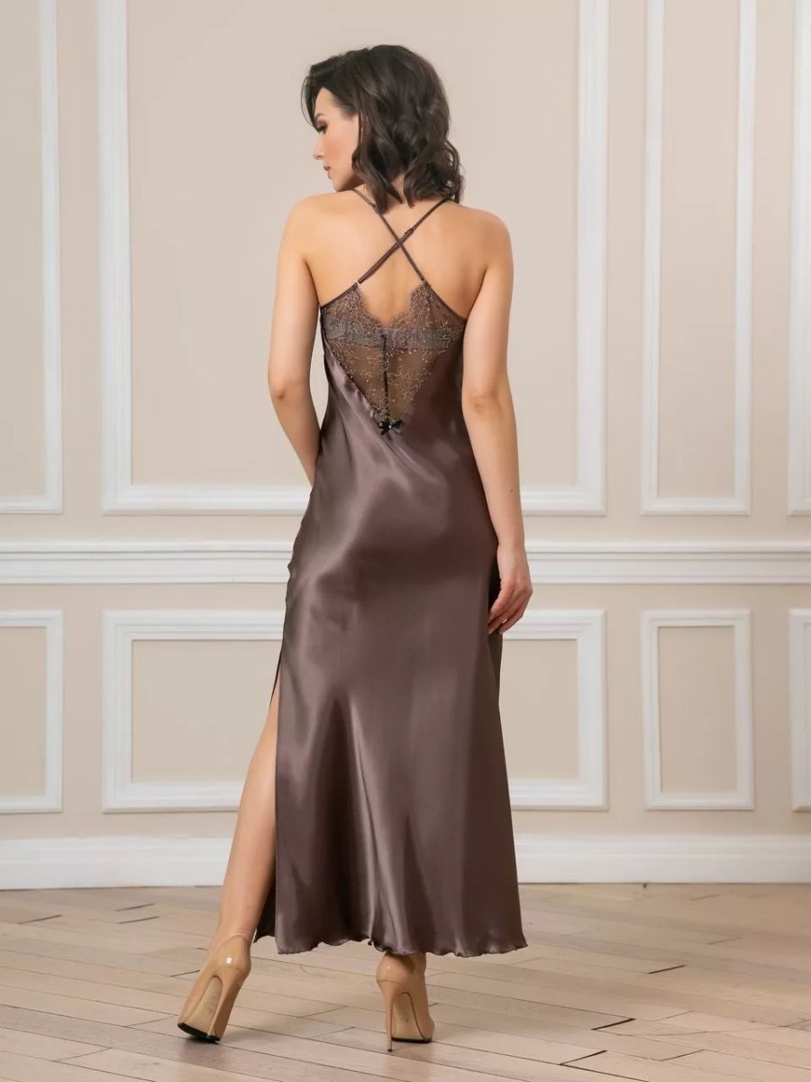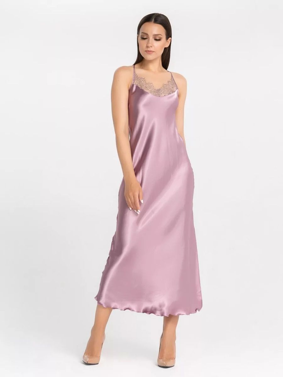 Длинная сорочка на узких бретелях из искусственного шелка, декорирована кружевом по линии декольте и разрезом до колена.