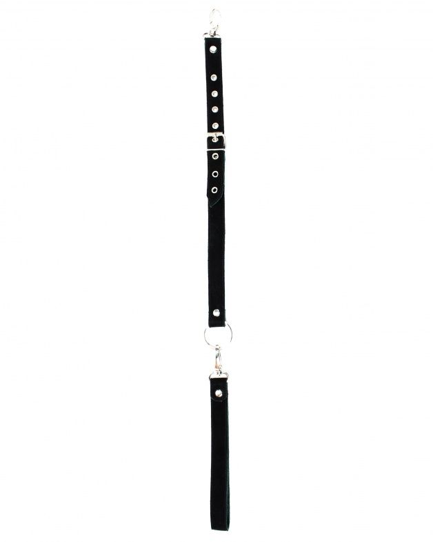 Поводок с одной стороны выполнен из натуральной кожи, а с другой стороны - из замши. Длина изделия регулируется металлической пряжкой, карабины и кольцо надежно фиксируют в подчинении, обеспечивая погружение в сладкий мир ограничений.